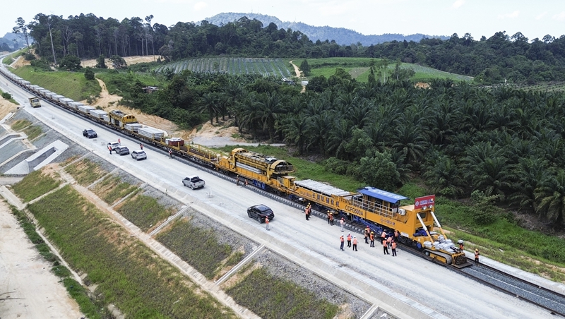这是2024年5月6日在马来西亚彭亨州航拍的马东铁项目的铺轨现场。
