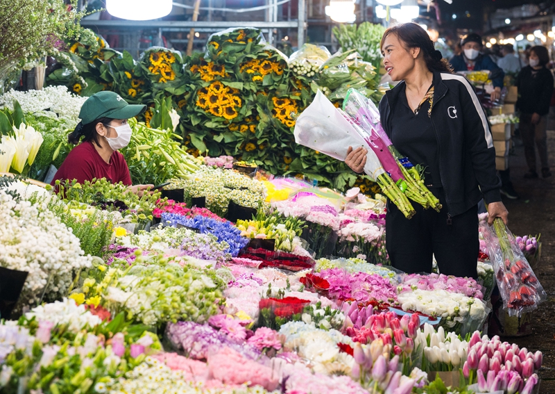 2025年3月28日,一名女子在越南河内广霸花市购买鲜花。