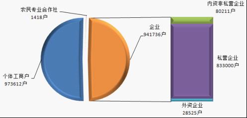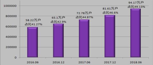 从近两年企业占比来看,增幅较大。2016年、2017年、2018年上半年企业总量分别占市场主体总量的42.9%、46.6%和49.13%(详见图3)。
