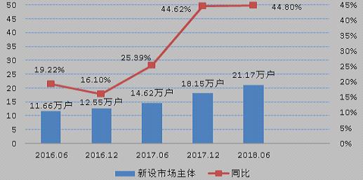 (一)市场主体总量发展情况。截至2018年6月末,全市实有各类市场主体191.68万户,同比增加29.51万户,增长18.19%。2016年以来,改革效应持续释放,全市实有市场主体持续保持高位增长(详见图1)。