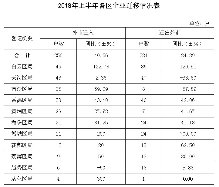 从各区企业迁移情况来看,上半年,迁入企业排名前5的区分别是:白云49户,天河43户,南沙35户,番禺33户,黄埔23户。迁出企业排名前5的区分别是:白云86户,天河47户,番禺40户,海珠24户,增城24户(详见下表)。