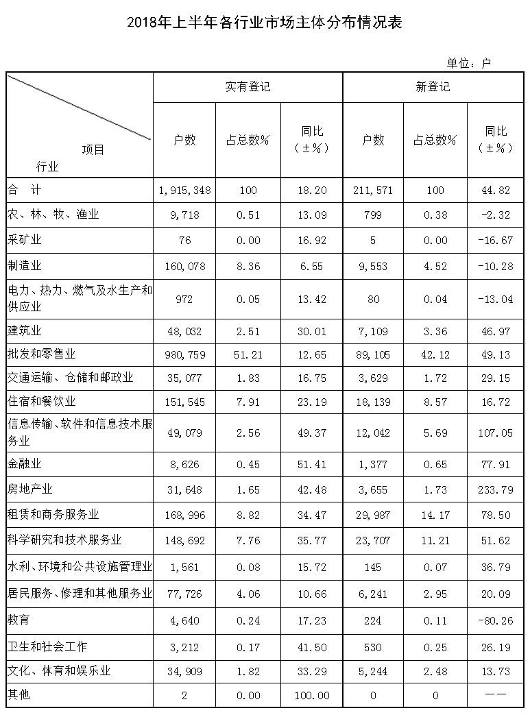 从表中看出,2018年上半年,我市各行业发展呈现以下态势:一是新登记市场主体行业相对集中。较为集中的5个行业依次为:批发和零售业8.91万户,占42.12%;租赁和商务服务业3万户,占14.17%;科学研究和技术服务业2.37万户,占11.21%;住宿和餐饮业1.81万户,占8.57%;信息传输、软件和信息技术服务业1.2万户,占5.69%。上述五大行业占据新登记市场主体总量81.76%,同比增幅分别为49.13%、78.5%、51.62%、16.72%和107.05%。二是房地产、金融业市场主体增幅大。全市新登记房地产业市场主体0.37万户,同比增长233.79%;金融业市场主体1.38万户,同比增长77.91%。三是制造业市场主体呈负增长,教育市场主体降幅明显。全市新登记制造业市场主体0.96万户,同比下降10.28%。随着2017年9月新修订的《中华人民共和国民办教育促进法》正式实施,“营利性民办学校(营利性民办机构)办学许可”调整为工商登记前置审批事项,以及我市对校外培训机构的集中排查整治,教育市场主体同比下降80.26%,降幅明显。