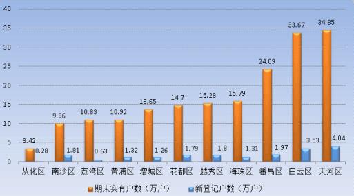 (四)各区市场主体发展情况。截至2018年6月末,市场主体总量排名前3的区依次是:天河34.35万户,白云33.67万户,番禺24.09万户,3个区市场主体总量占全市的48.05%。从新登记数量来看,排名前3的区依次是:天河4.04万户,白云3.53万户,番禺1.97万户,占全市新登记的45.06%。市场主体总量和新登记数量区域聚集特征明显。但从新登记市场主体增幅来看,增幅排名前3的区依次是:南沙73.91%,越秀72.28%,花都65.56%(详见图5)。