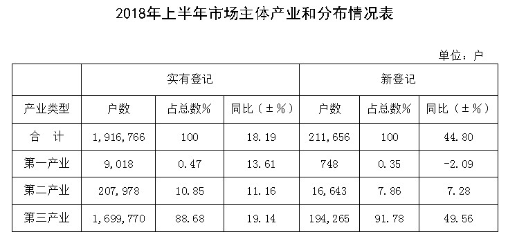 (三)三大产业发展情况。2018年上半年,一、二、三产业新登记市场主体分别为0.075万户、1.66万户、19.43万户,分别同比增长-2.09%、7.28%和49.56%,第一产业呈现负增长,第二产业增速放缓,第三产业增速领先,市场主体结构变化平稳。截至2018年6月末,三大产业实有市场主体分别为0.9万户、20.8万户、169.98万户,分别同比增长13.61%、11.16%和19.14%,我市产业结构持续优化(详见下表)。