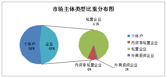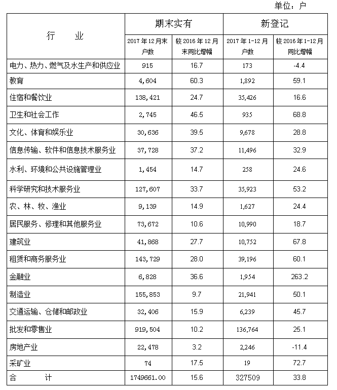 截至2017年12月末,全市实有各类市场主体175.1万户,同比增长15.4%。其中:企业81.6万户,同比增长25.3%,占市场主体总量比例(下称占比)46.6%;个体工商户93.4万户,同比增长8.2%,占比53.3%。
