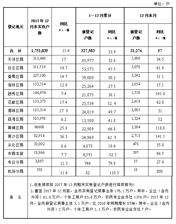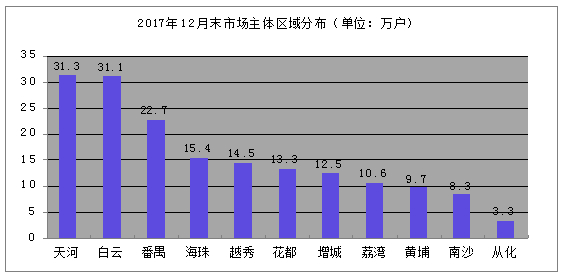 截至12月末,市场主体总量超过30万户的有天河、白云2个行政区,20—30万户的是番禺区,10-20万户的有海珠、越秀、花都、增城、荔湾5个行政区,10万户以下的有黄埔、南沙、从化3个行政区。