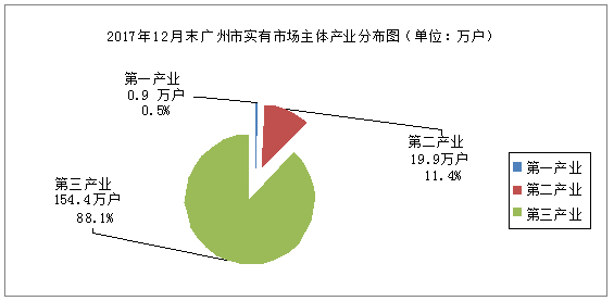 截至12月末,全市实有第一产业市场主体0.9万户,同比增长15.1%,占比0.5%;第二产业市场主体19.9万户,同比增长13.2%,占比11.4%;第三产业市场主体154.4万户,同比增长16.1%,占比88.1%。