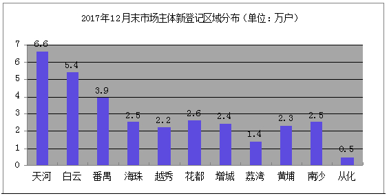 1-12月,新登记市场主体超过5万户以上的有天河区、白云区2个行政区,3-5万户的是番禺区,2-3万户的有海珠、越秀、花都、增城、南沙、黄埔6个行政区,1-2万户的是荔湾区,1万户以下的是从化区。