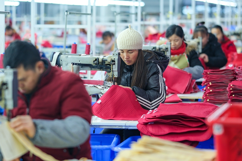 2024年1月18日,社区居民在红安社区的乡村振兴就业车间工作。红安社区是由易地搬迁安置区单独成立的新社区,位于湖南省湘西土家族苗族自治州凤凰县禾库镇。