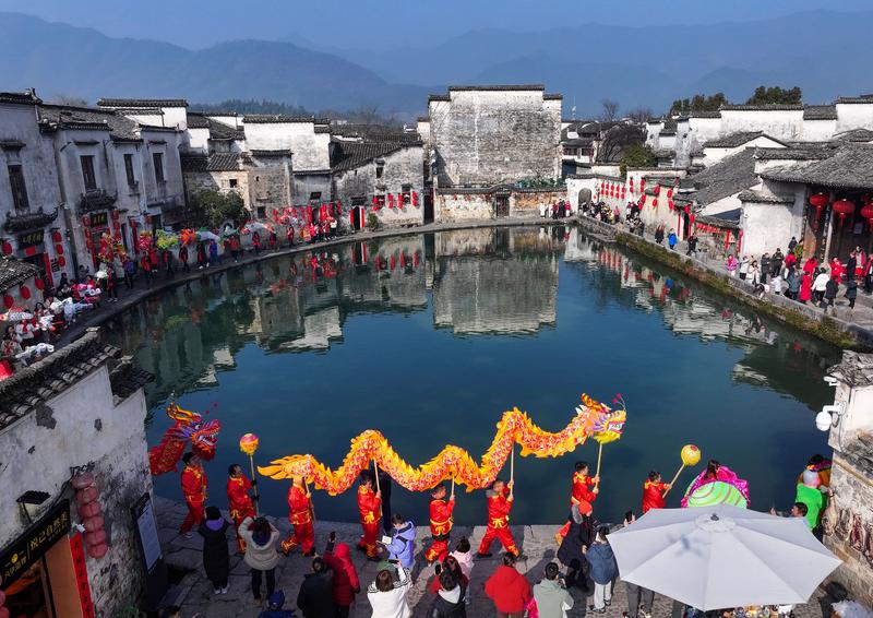 民俗舞龙表演队伍在安徽省黄山市黟县宏村巡游(2025年2月10日摄,无人机照片)。